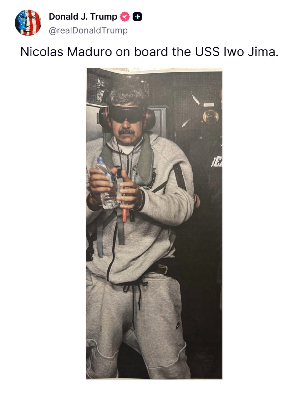 Caracas est bombardé dans la nuit par les États-Unis. Quelques heures plus tard, Maduro et sa femme Cilia Flores sont capturés et emmenés vers le centre de détention provisoire de Brooklyn (New-York).