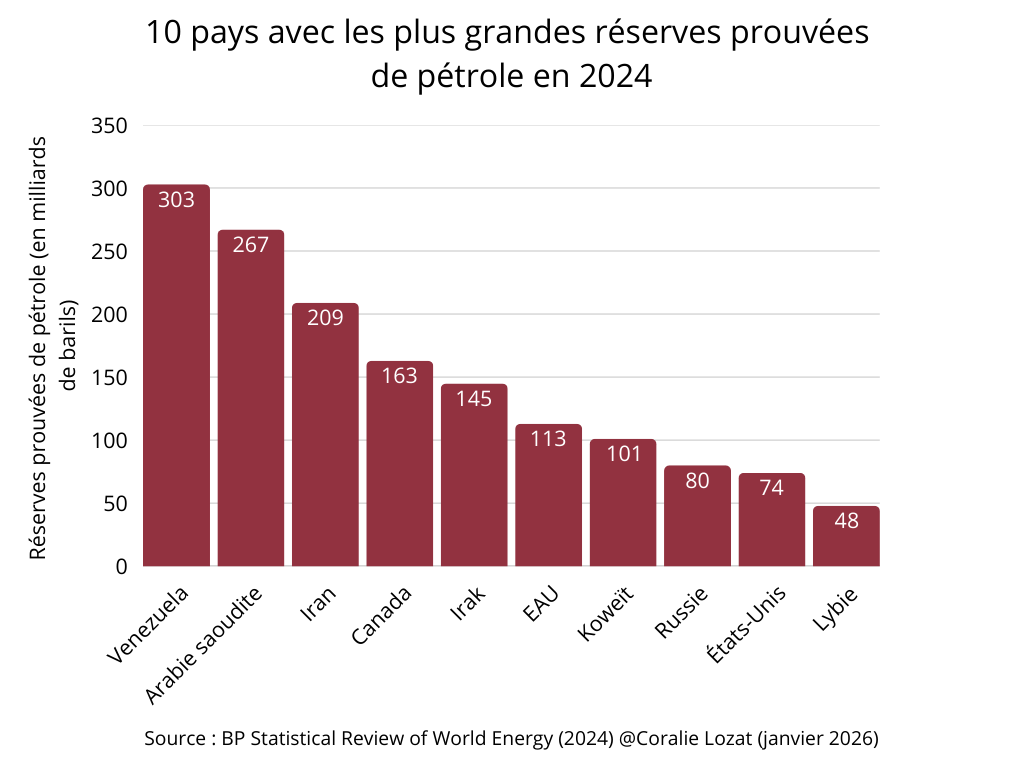 Le Venezuela possède les plus grandes réserves prouvées de pétrole au monde (303 milliards de barils), devant l'Arabie saoudite (267 milliards de barils) et l'Iran (209 milliards de barils). Prendre le contrôle du Venezuela, c'est prendre le contrôle de ses ressources en hydrocarbures.
